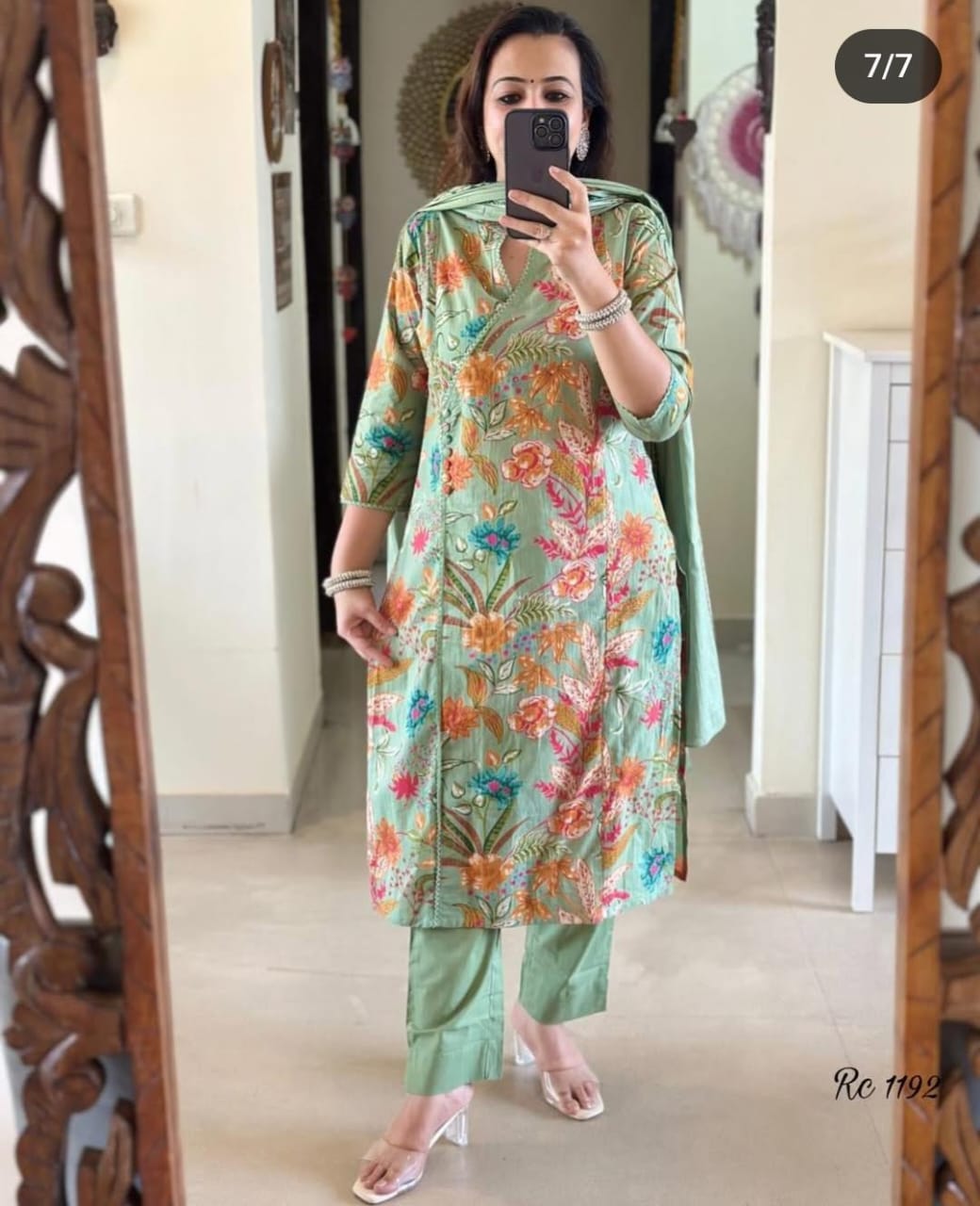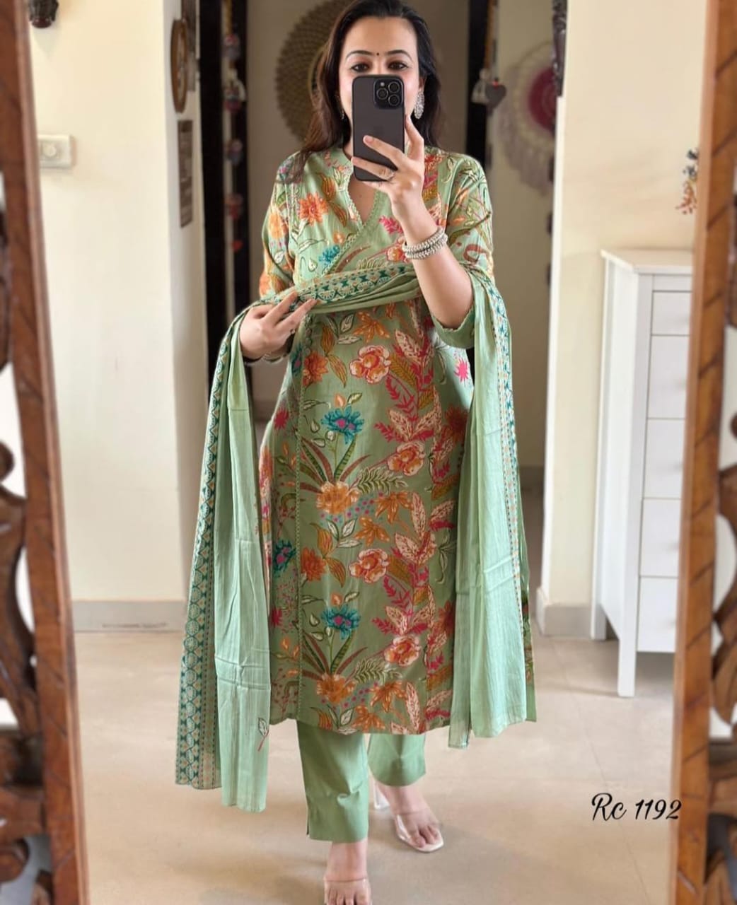 Elegant Angrakha style cotton suit with beautiful floral print in dual tones of green and brown. Stylish and comfortable for all-day wear.