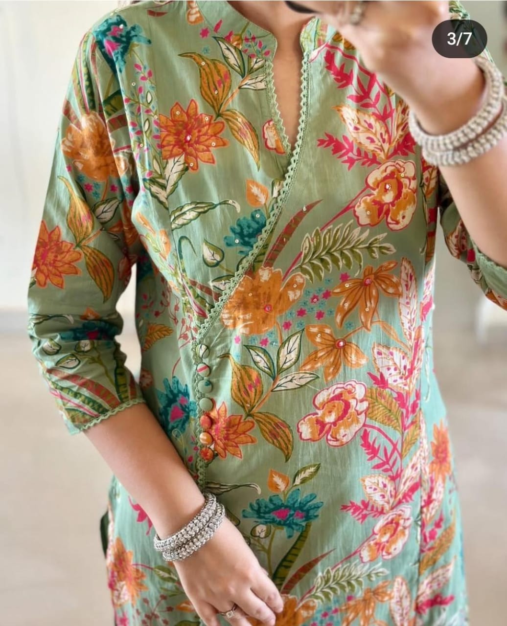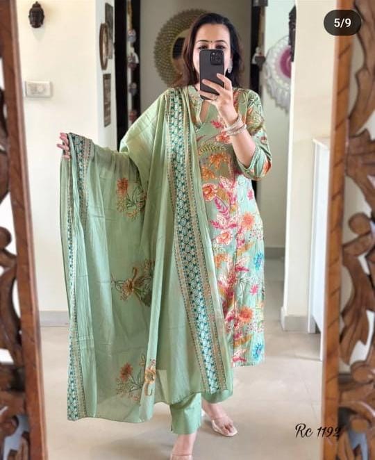 This Cotton  Angrakha Suit blends traditional charm with modern elegance. Crafted from premium-quality cotton fabric, it offers exceptional comfort and breathability. The Angrakha pattern adds a graceful touch, while the vibrant floral print in green and brown enhances its appeal. Perfect for festive gatherings, casual outings, and everyday wear, this suit ensures you look stylish without compromising on comfort. Available in sizes M, L, XXL, and 3XL to suit your fit preference. Pair it with your favorite accessories for a complete ethnic look.