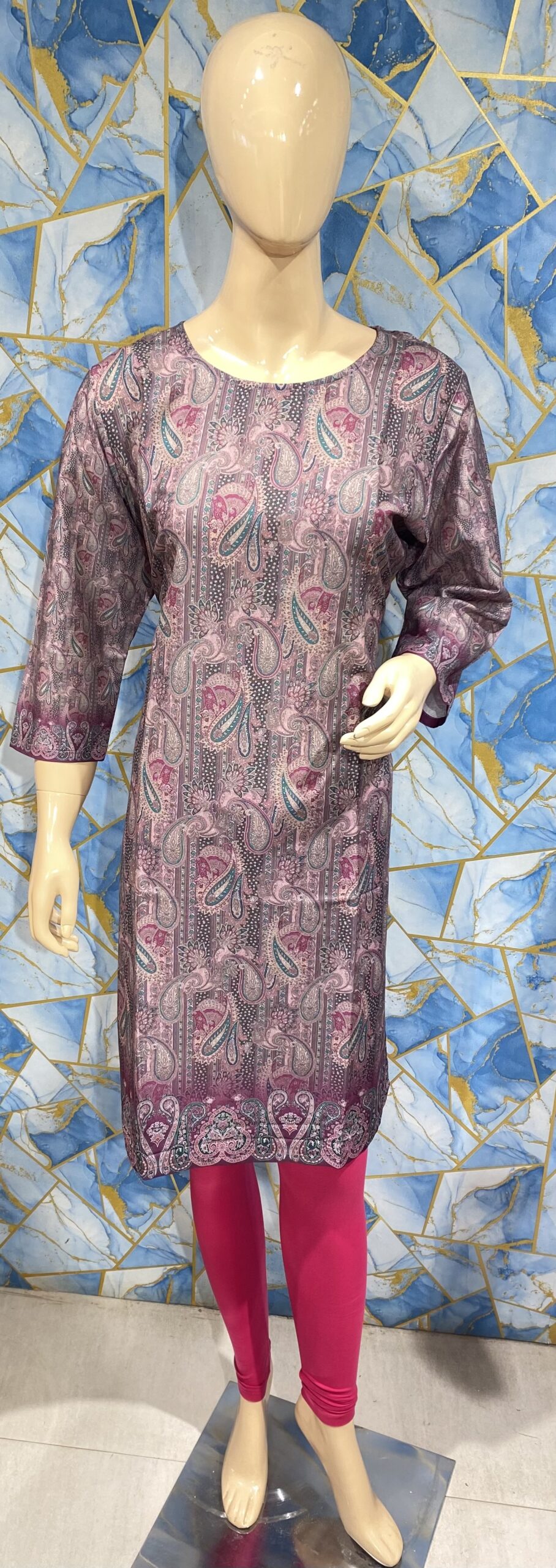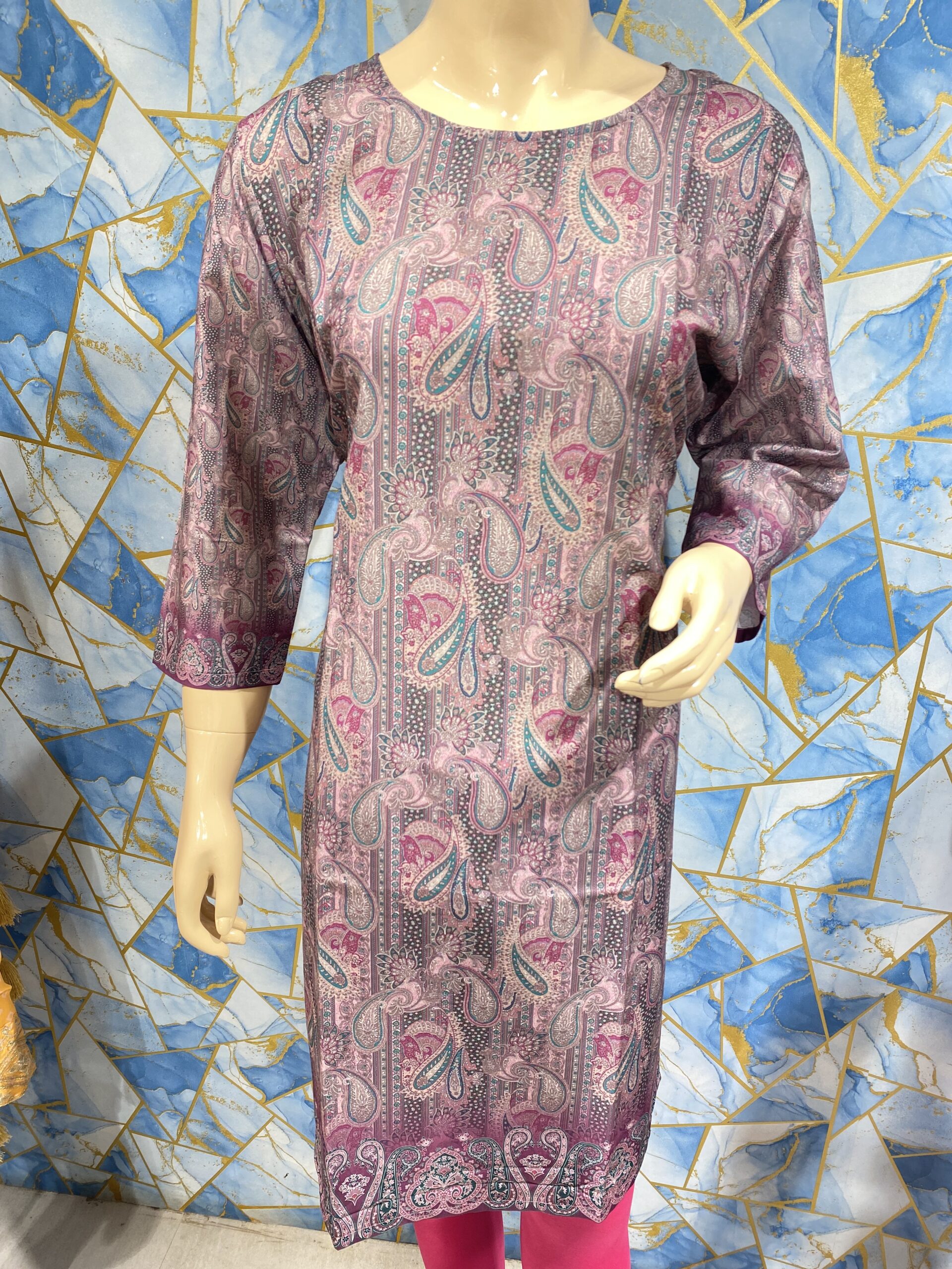 Single piece full-length kurti made from premium quality Maslin cloth that offers a soft, breathable, and comfortable feel. It features an elegant paisley print design that brings a rich traditional touch. The circle neck style adds simplicity and charm to the outfit. This kurti is perfect for everyday wear, festive occasions, or casual outings. Style it with leggings, churidars, or pants for a graceful ethnic look that stands out effortlessly.